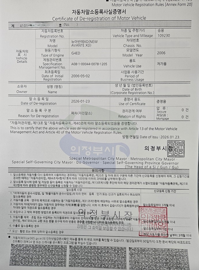 [뉴아반떼XD 폐차후기] 하루만에 말소까지 완료됐어요.